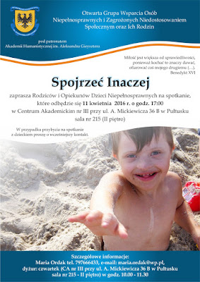 „Spojrzeć Inaczej” zaprasza Rodziców i Opiekunów Dzieci niepełnosprawnych na spotkanie, które obędzie się 11 kwietnia 2016 o godz. 17.00 w Centrum
